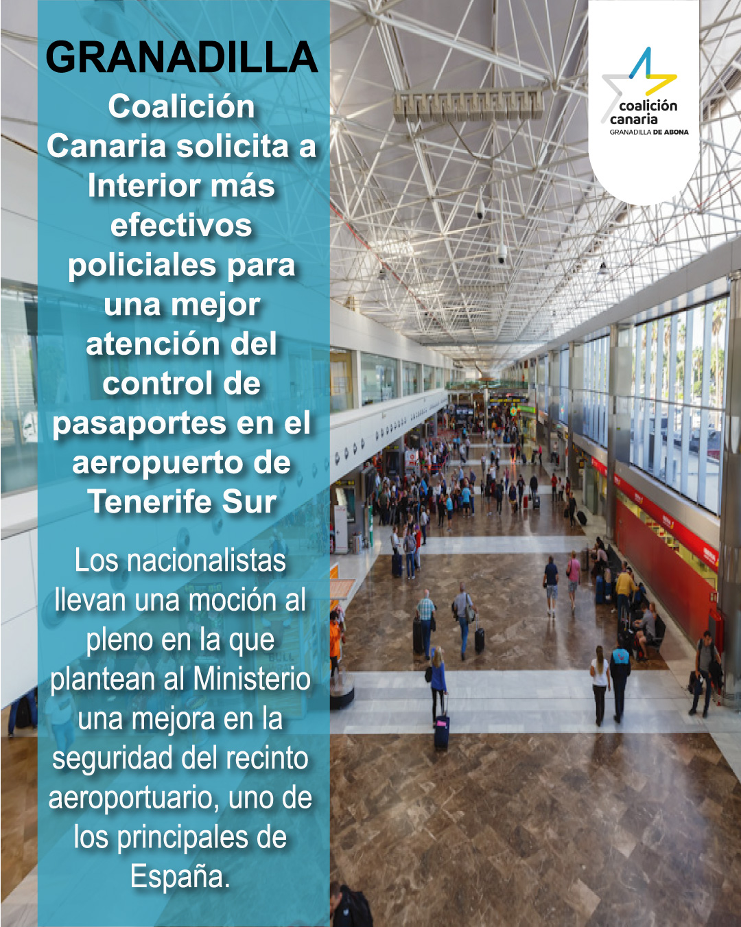 Coalición Canaria de Granadilla de Abona ha presentado una moción al próximo pleno de la Corporación en la que solicita al Ministerio del Interior la ampliación de los efectivos de la Policía Nacional para atender eficazmente el control de pasaportes para mejorar la seguridad del aeropuerto de Tenerife Sur.