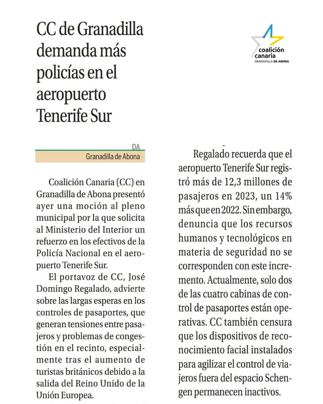 El portavoz de CC en el municipio, José Domingo Regalado, recuerda que el aeropuerto Tenerife Sur es la principal puerta de entrada a la Isla de Tenerife. El año pasado contó con 12.337.244 de pasajeros, lo que supuso un aumento del 14% con respecto al 2022. Estas cifras lo convierten en el séptimo aeropuerto de España en número de pasajeros y el noveno en movimiento de aeronaves.