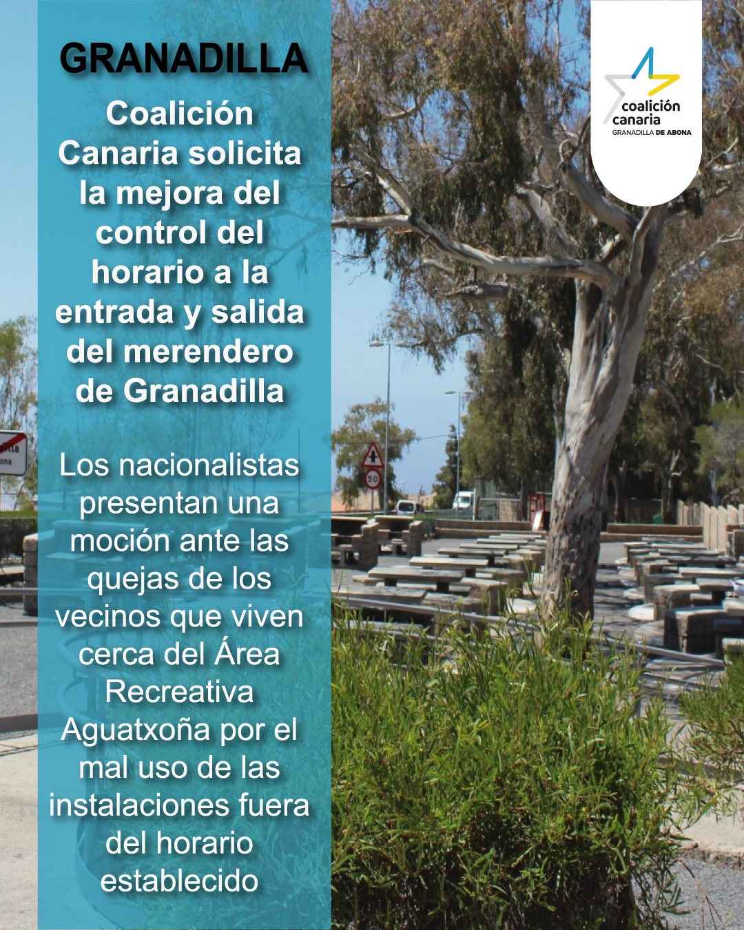 Coalición Canaria de Granadilla de Abona ha presentado una moción al próximo pleno de la Corporación en la que solicita la mejora del control de acceso en la entrada y en la salida del merendero del municipio, concretamente, que se abra a las 07:00 horas de la mañana y se cierre del área recreativa a las 22:00 horas de la noche.