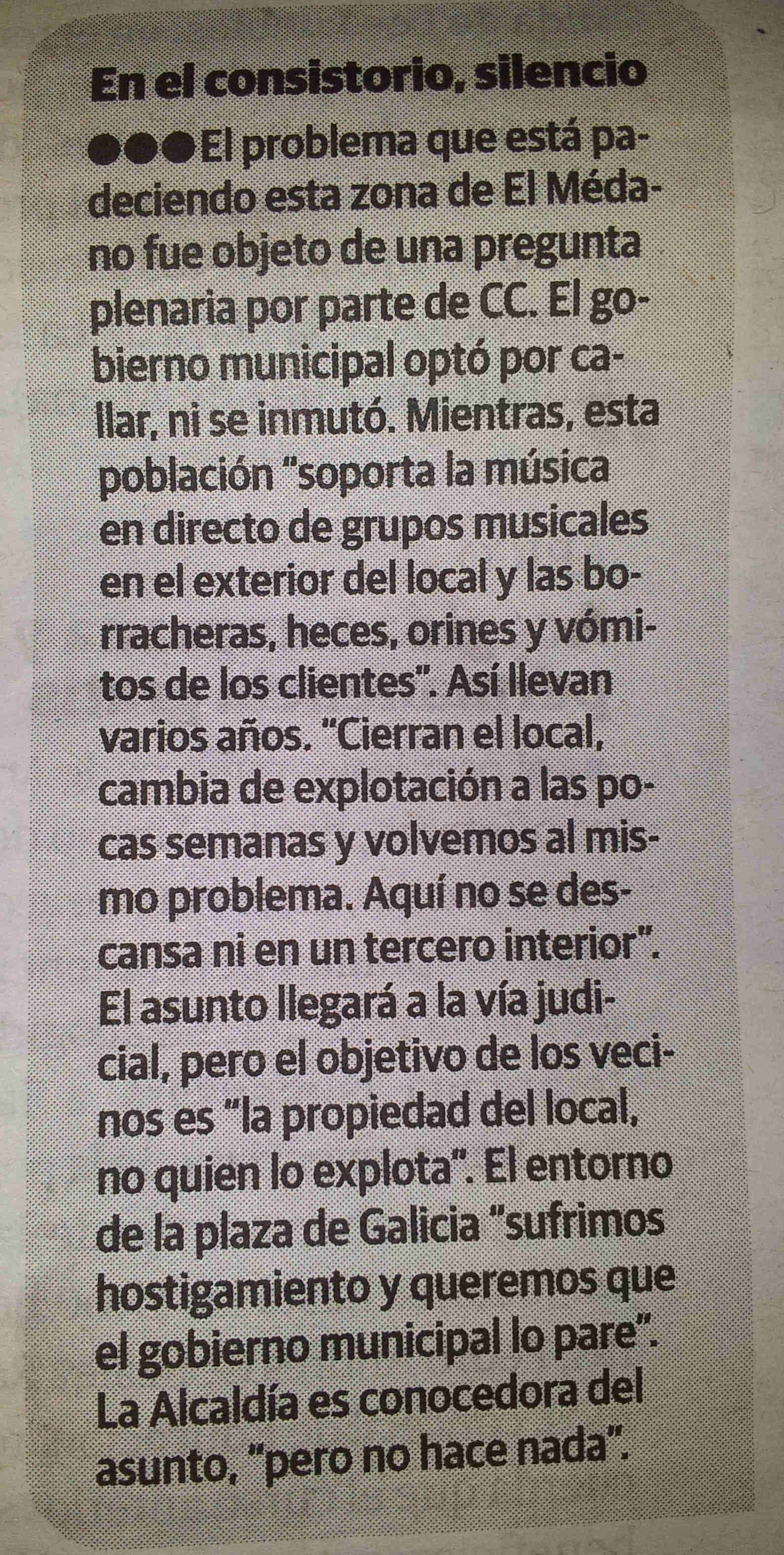 El miércoles 30 de julio salía publicado en el periódico El Día, la respuesta que dieron a Coalición Canaria en el último pleno ordinario celebrado el lunes 28 de julio, en el Ayuntamiento de Granadilla, cuando preguntábamos al bipartito, compuesto por el PSOE y el PP, por las acciones que se estaban llevando a cabo para que los vecinos y vecinas de la plaza de Galicia en El Médano tuvieran derecho al descanso. Tal y como lo refleja el titular, ante nuestra intervención sólo hubo silencio.