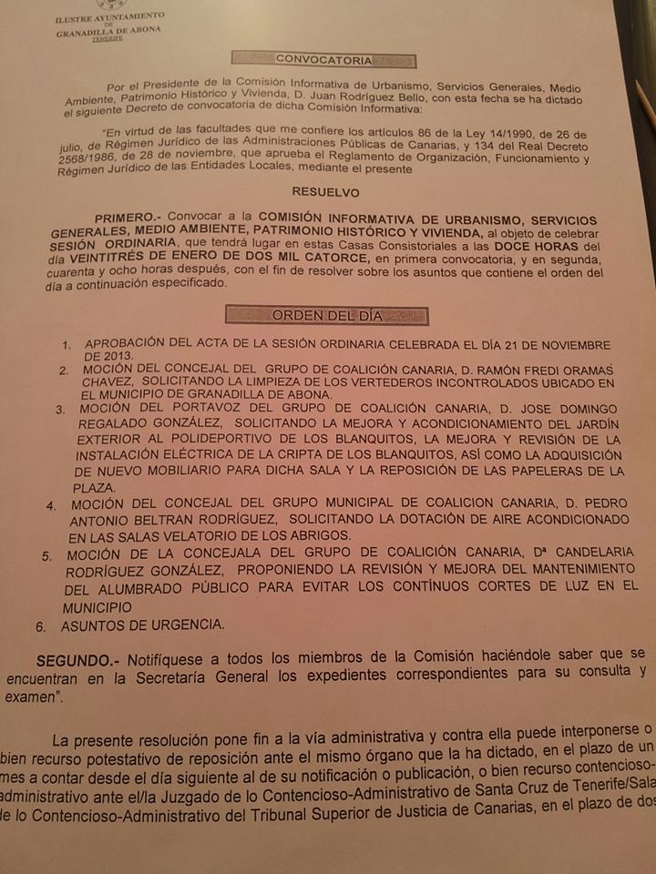 Nuestro grupo municipal ha presentado cuatro mociones que se han debatido en la comisión de Servicios Generales celebrada el pasado jueves 23 de enero de 2014. Todas las mociones presentadas en esta comisión son de Coalición Canaria: