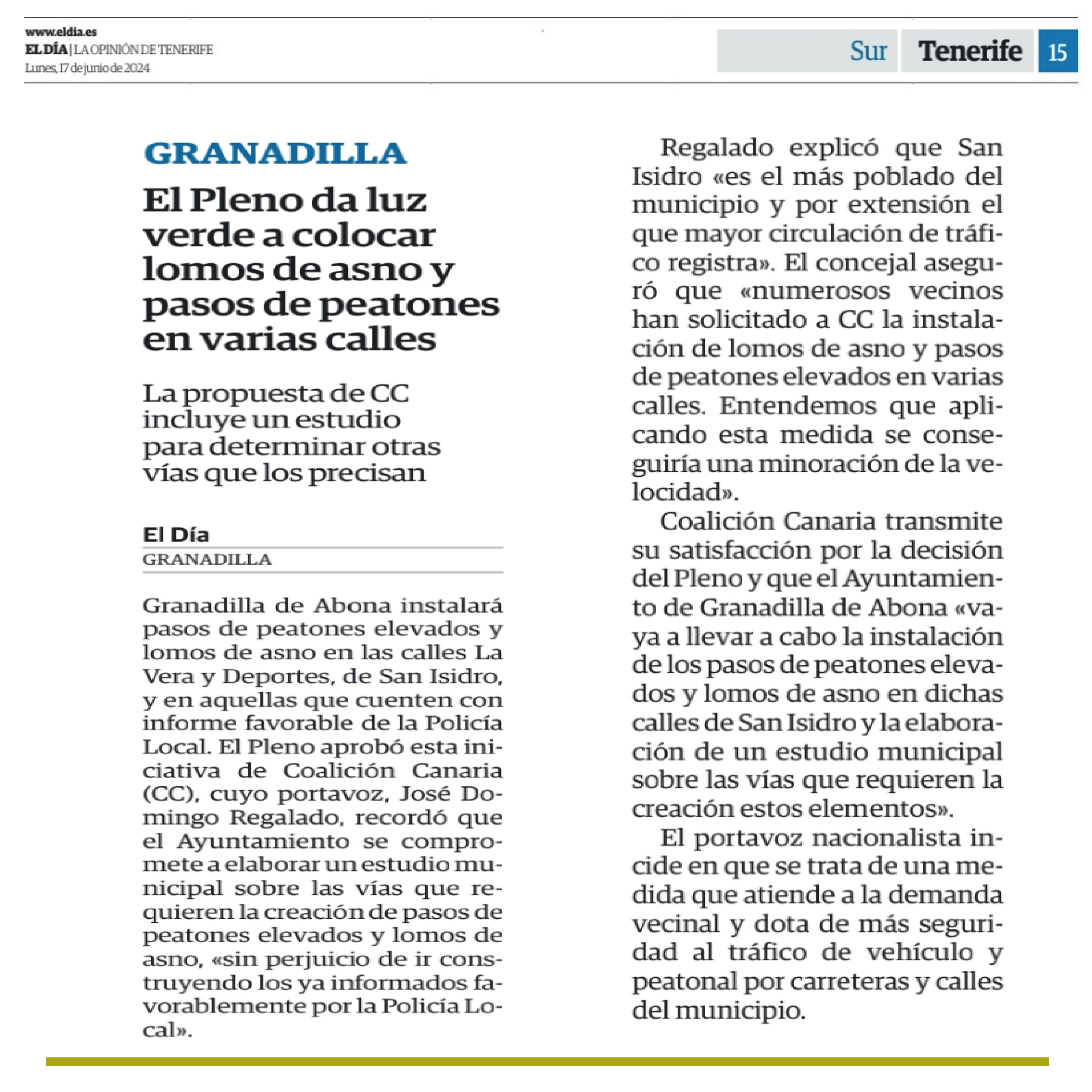 Coalición Canaria de Granadilla de Abona propuso la instalación de pasos de peatones elevados y lomos de asno en varias calles de San Isidro, concretamente en las vías La Vera y Deportes, así como en aquellas que cuenten con un informe favorable de la Policía Local del municipio de Granadilla de Abona.