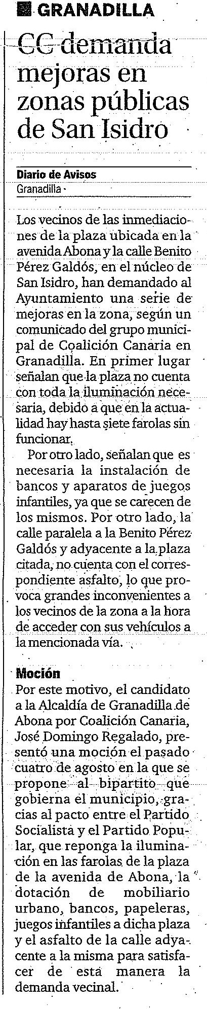 En la edición del jueves 21 de agosto del periódico Diario de Avisos, recogen una nueva demanda de Coalición Canaria de Granadilla de Abona. Les adjuntamos la noticia.