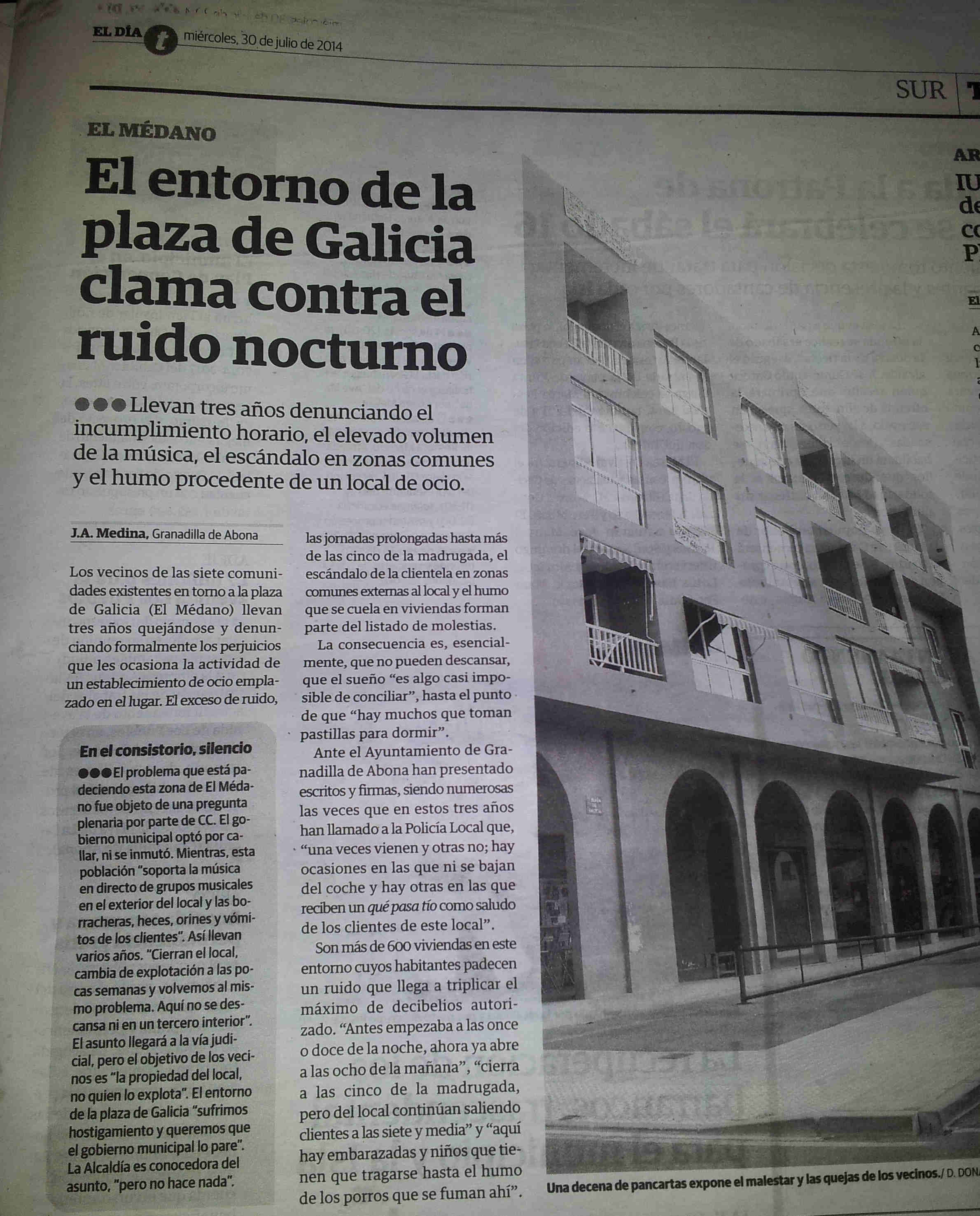 El miércoles 30 de julio salía publicado en el periódico El Día, la respuesta que dieron a Coalición Canaria en el último pleno ordinario celebrado el lunes 28 de julio, en el Ayuntamiento de Granadilla, cuando preguntábamos al bipartito, compuesto por el PSOE y el PP, por las acciones que se estaban llevando a cabo para que los vecinos y vecinas de la plaza de Galicia en El Médano tuvieran derecho al descanso. Tal y como lo refleja el titular, ante nuestra intervención sólo hubo silencio.