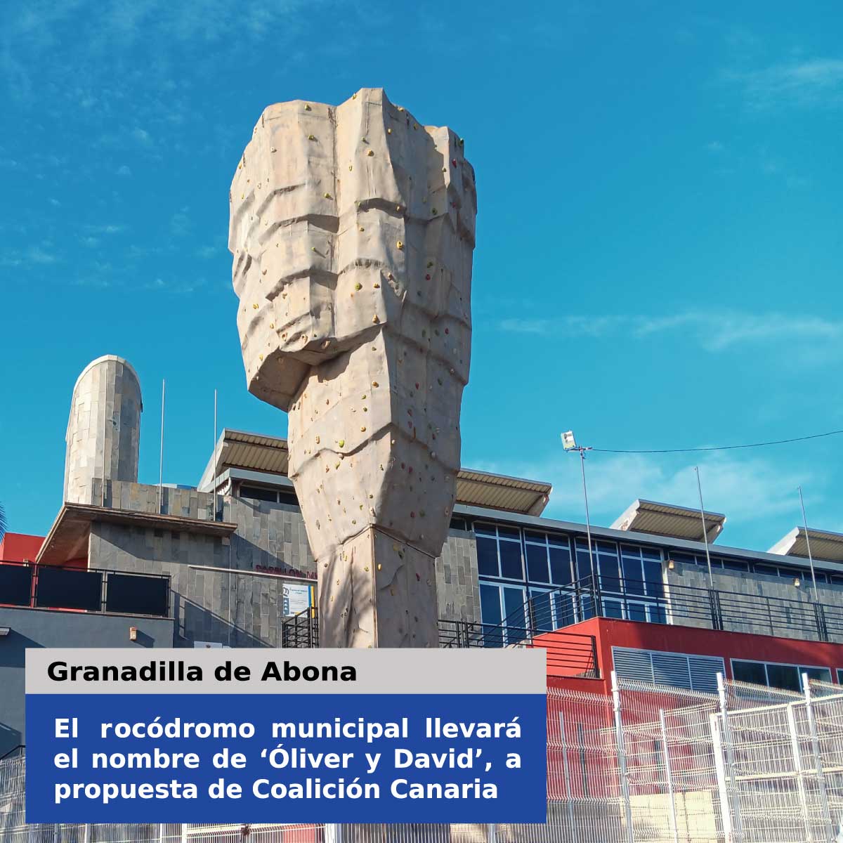 Coalición Canaria de Granadilla de Abona comunica que se ha aprobado la moción presentada al último pleno de la Corporación local para denominar al rocódromo municipal ubicado actualmente en los exteriores del Pabellón Municipal de Deportes de Los Hinojeros con el nombre de ‘Óliver y David’, en recuerdo y admiración de los montañeros Óliver Darias Álvarez y David Adolfo Gómez Casanova, en el tercer aniversario de su fallecimiento.